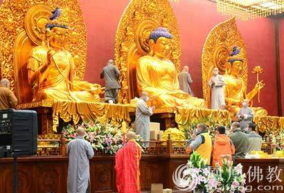 最后是安放大势至菩萨的命心。本通法师拈香归位后,三称三拜大势至菩萨,并恭请命心安放。待命心安放完毕后,令众生无限感仰的西方三圣的命心全部安放完毕。本通法师上前恭敬瞻仰,而后归位问讯。慧参法师带领大众恭敬唱念《大势至菩萨礼赞文》:皈命大势至菩萨,光明炽盛度众生。我今皈依安圣位,惟愿慈悲哀摄受!