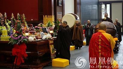 先是安放西方接引导师阿弥陀佛的命心。随着庄严、深邃、空明的海螺声响起,本通法师拈香归位,在钟鼓齐鸣中,三称三拜导师阿弥陀佛,并恭请命心安放。维那师慧参法师带领大众深情唱念《阿弥陀佛礼赞文》:归命弥陀大导师,大悲愿力度群萌。我今皈依安圣位,唯愿慈悲哀摄受!