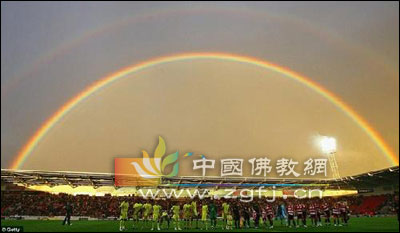 26日晚,英国联赛杯在英国唐卡斯特郡Keepmoat体育场进行。正当唐卡斯特球队同托特纳姆热刺球队开始进行第二轮比赛时,球场上空忽然出现了罕见明艳的双重彩虹,形成了一幅漂亮的球场背景幕。