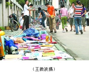 服装、鞋帽、箱包、书籍、杂志、饰品、玩具、凉席、台灯、CD……昨天下午,中国传媒大学36号宿舍楼前,毕业生们摆上了摊,琳琅满目的二手商品让人看得眼花缭乱。正摆摊卖电磁炉的刘丽同学告诉记者:“我们马上就毕业离校了,像电磁炉这样的东西我们也不方便带走,而学弟学妹们正好需要。”一位购买二手商品的同学说:“我们从师兄师姐那儿买东西时,通常会有学习、考试、找工作方面的交流,小小的跳蚤市场还发挥了其他的作用。”记者发现,连一些周边居民也赶来“淘宝”,凉席、电风扇、台灯等最受欢迎。