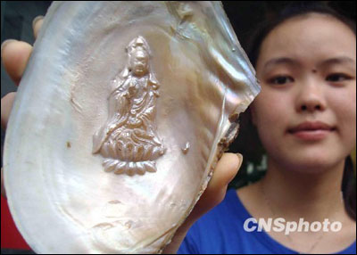 9月2日,一名女士展示长有“观音菩萨”造型的蚌壳。近日,苏州山塘街一家珍珠商店内上柜销售的长有“观音菩萨”造型的蚌壳,吸引了引起了许多游客的目光。据悉,这种采用“人工技术”使蚌壳长出的“观音菩萨”,栩栩如生,十分逼真。(稿源:中国新闻网)