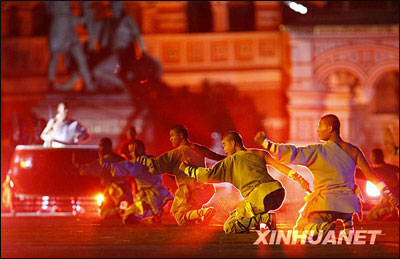 9月4日晚,在俄罗斯莫斯科市中心的红场上举行的俄罗斯国际军乐节开幕前夕的总彩排上,中国少林武僧在表演节目。当晚,来自俄罗斯、中国、意大利等国的约千名演员参加了俄罗斯国际军乐节开幕前夕的总彩排。其中,中国嵩山少林寺武僧们展示的棍法、鞭法等中国功夫令在场观众惊叹不已。