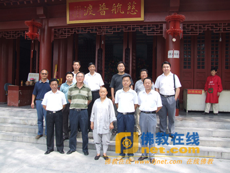 在大士岩寺的大雄宝殿前,徐州市佛教协会副会长、大士岩寺住持能海法师与客人合影留念。