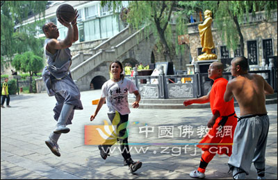 河南少林寺武僧和来自美国在少林寺学艺的女学生一起打篮球。长期以来,少林寺坚持开放的文化观念,使佛教精神得到有效弘扬和传播。(稿源:人民摄影报)