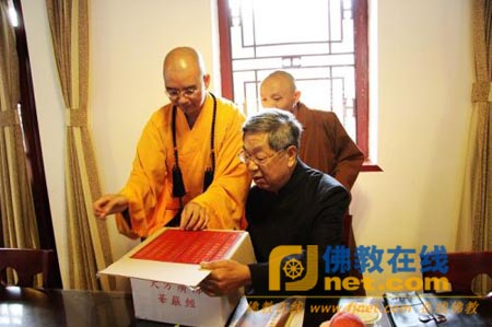 2009年9月3日,全国人大常委会原副委员长、中华社会救助基金会首任理事长许嘉璐一行参访北京龙泉寺,龙泉寺方丈学诚法师亲率龙泉寺两序大众前往山门迎接。参访过程中,许嘉璐理事长与学诚法师进行了亲切座谈。双方就佛教思想、传统文化发展、佛教教育及“身心”关系问题等做了深入探讨。学诚法师还向许嘉璐理事长赠送了一套《八十华严》以作纪念。(图片来源:学诚法师博客)