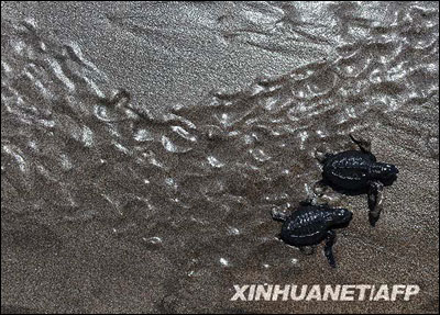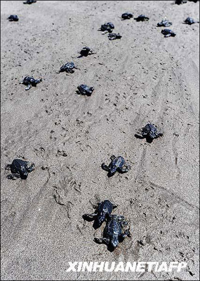 9月19日,在萨尔瓦多首都圣萨尔瓦多市以南的海滩上,两只小海龟爬向大海。当日,环保志愿者在萨尔瓦多的海岸放归了2000只小海龟。