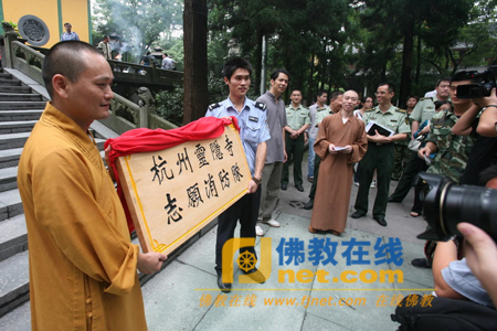 2009年9月24日,浙江省首家寺院志愿消防队在杭州灵隐寺成立。当日,寺内举行了消防演习。灵隐寺消防负责人觉恒法师告诉记者:“我们的消防队不但保障寺院消防安全,还可以协助附近白乐桥、天竺等灵隐社区及周边山林防火防灾。”