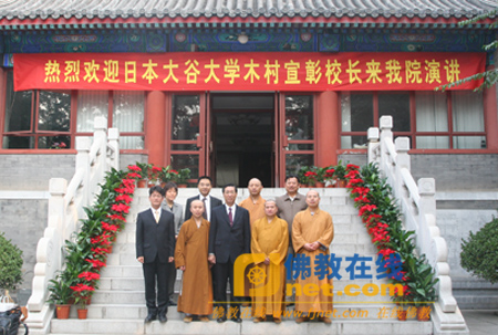 2009年10月10日上午9点,日本大谷大学及大谷大学短期大学部校长、真宗大谷派是谷山报土寺住持木村宣彰法师一行,在中国佛教协会国际部日本课李贺敏课长陪同下,到中国佛学院参访交流。中国佛学院教务部副主任广如法师、办公室张军主任等在该学院教学楼前迎接。