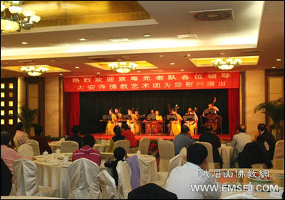 2009年10月9日,正值金秋时节,刚刚度过祖国60华诞和华夏传统中秋佳节的北方峨眉大安寺所处的中信国安第一城,迎来了京粤高尔夫元老队友谊比赛活动。活动在北京市老市长张百发先生的倡导下,由北京高尔夫协会和广东高尔夫协会联合举办。参加比赛的100多位选手中,大多是曾经为国家做出过卓越贡献的各界老前辈。为表达对他们的热烈欢迎,讴歌他们的功绩,祝贺他们的比赛圆满成功,祈祷他们的身体健康长寿,大安寺佛艺团特意安排专场为他们表演了以佛教文化为主的文艺节目,倍受元老队嘉宾的赞赏。