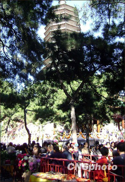 十四日清早,苍松翠柏掩映下,北京西山灵光寺香烟袅袅,红、黄两色布花与束束鲜花将八角十三层的密檐式舍利塔妆扮得分外喜兴;上千僧人、民众在近百位护法居士引领下礼拜、转塔。