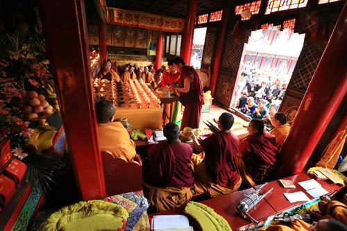 上午9时许,章嘉活佛普度众生的殊胜道场——镇海寺隆重举行伽蓝菩萨圣诞吉祥祈福法会,镇海寺大管家金光喇嘛主法并领众诚诵《吉祥经》等经典,以此祈正法久住、众生所求遂意、福慧增长、六时吉祥。