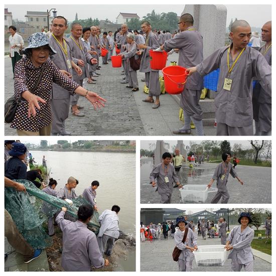 托钵活动结束后,由上世下炫大和尚主法,带领四众弟子,举行大型放生仪式。