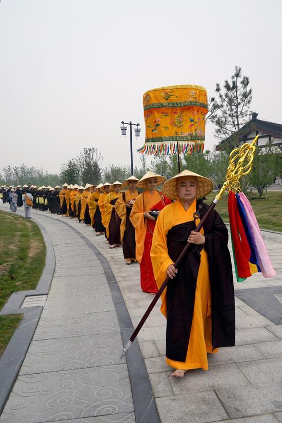 托钵活动正式开始时,由三位大和尚带领短期出家学员,身着法衣,头戴斗笠,手持瓦钵,威仪整肃,行脚从泰山寺行脚至广福寺,沿途接受信众供养。演习着佛陀当年托钵生活,学习佛陀的苦行,将佛陀的无畏慈悲、平等精神展示于大众。面对五欲六尘,历练是身心意志,让更多的信众了解佛法,尊重三宝,广种福田。沿途中,看到部分信众,虔诚跪拜供养每一位僧众食物,僧众以清净心为供养信众祝愿。有的信众因发心至诚,感观了佛陀的慈悲弘愿,从而深感落泪。