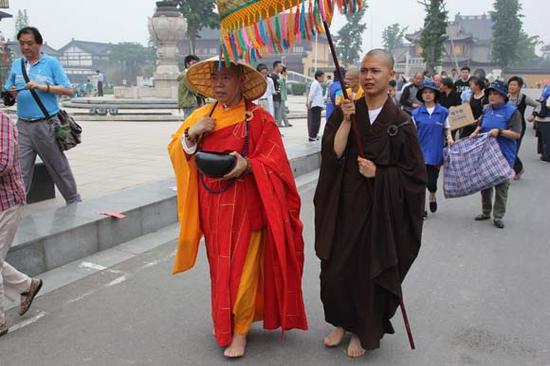弥陀寺短期出家戒会举行首次行脚托钵活动