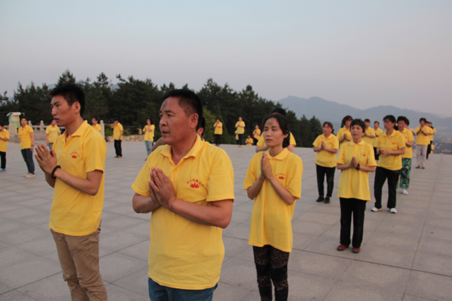 傍晚时分,大佛台上落日余晖、霞光流云,景象非常殊胜。居士们沐浴在阿弥陀佛的慈悲光明中,信心满怀,法喜充满。