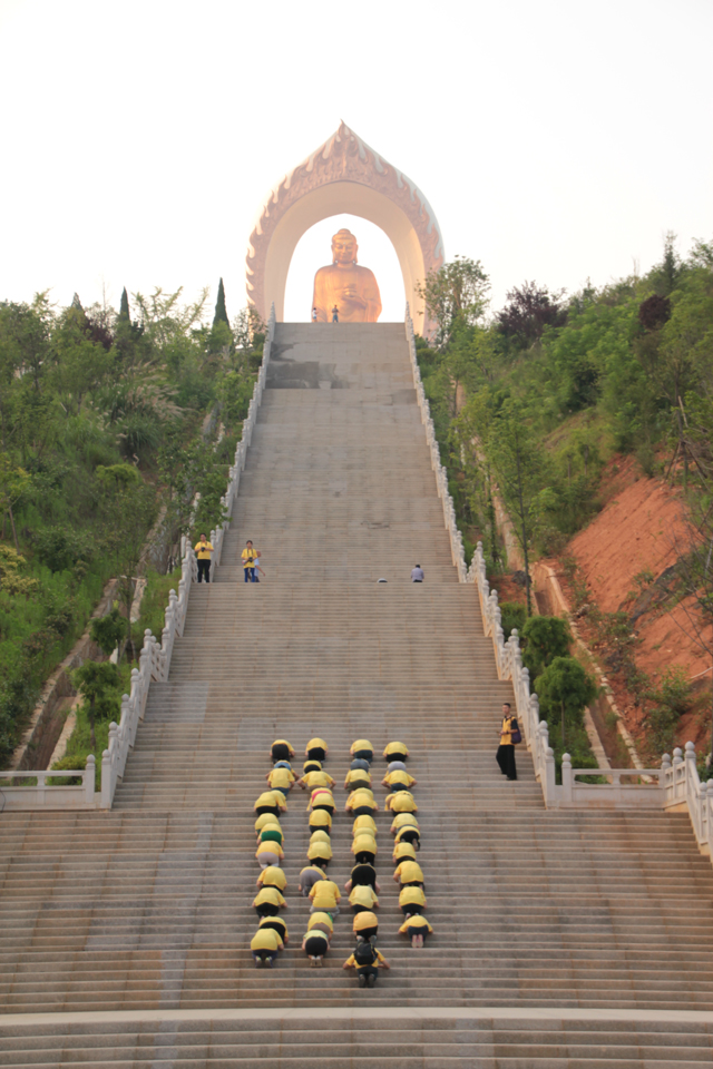 之后,居士们从信愿路起香,三步一拜至拜佛台,虔诚礼佛。随后又来到大佛台,瞻礼阿弥陀佛接引圣像,并绕佛七匝,郑重发愿:普愿天下有情皆能蒙阿弥陀佛接引,往生西方极乐世界,究竟解脱。