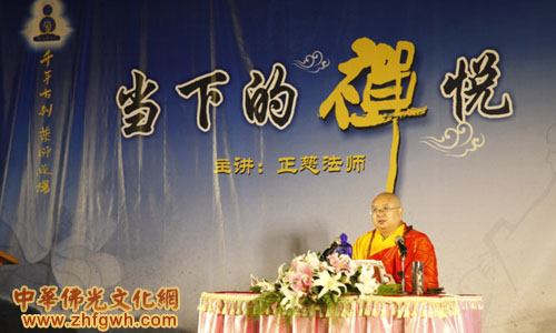 正慈大和尚为听众开示了禅的由来及妙用,详细讲述了坐禅、行禅、立禅的具体方法,并敲引磬带领数百名听众共同静坐,体验禅的静谧和安宁。他在开示中引用了古德“饥来吃饭困来眠”的公案,并针对日常生活阐述了吃饭禅、睡觉禅、喝茶禅等独到的禅修形式。
