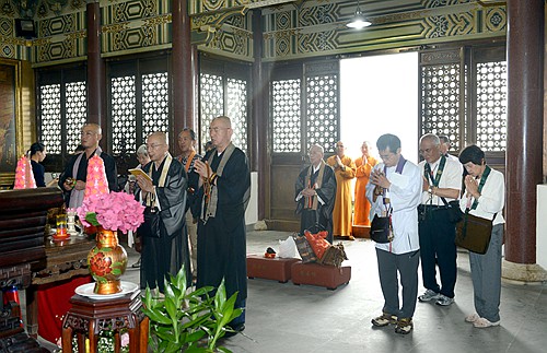 图1:日本中国观音灵场会米田会长带领朝圣团在普济禅寺圆通宝殿诵经祈福