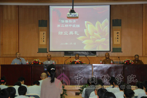 2014年7月5日下午,中国佛学院第二期“法海探源”中级班结业典礼及汇报演出在中国佛学院礼堂举行。中国佛学院副教务长广如法师、培训部主任容通法师、副主任法广法师以及教务处海轮法师、传静法师共同出席了结业典礼。结业典礼由容通法师主持。