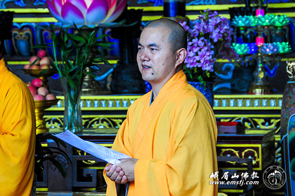 峨眉山佛教协会副会长兼秘书长宏开法师代表佛教协会向新受披剃的佛弟子们表示祝贺,他希望弟子们在以后的学修生活中,侍师如父,多向师父请教,从闻思修,入三摩地,精勤实践普贤菩萨行愿精神,将来成为荷担如来家业的栋梁之材。