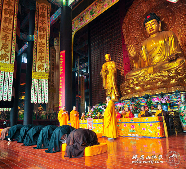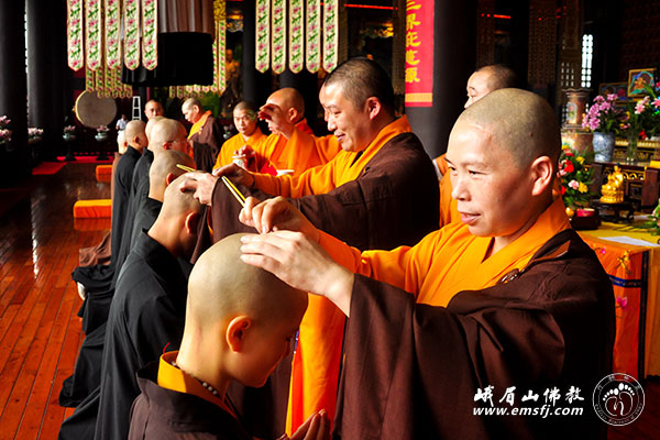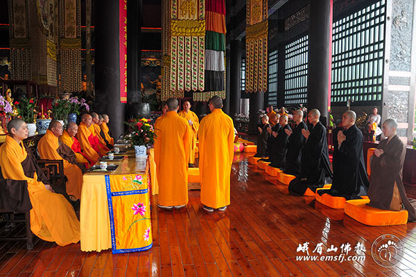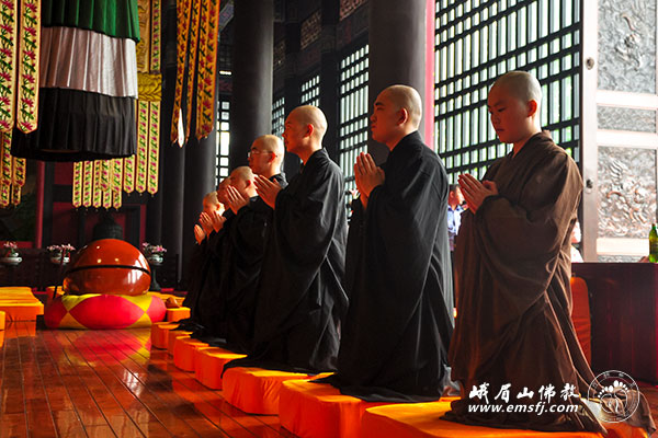 2014年7月15日,农历六月十九,恭逢观世音菩萨成道纪念日,人天同庆,诸佛欢喜。峨眉山佛教协会在峨眉山大佛禅院大雄宝殿举行庄严的拜师剃度仪式,7名考察僧经考察合格后,正式拜师、剃度,成为清净沙弥、沙弥尼。
