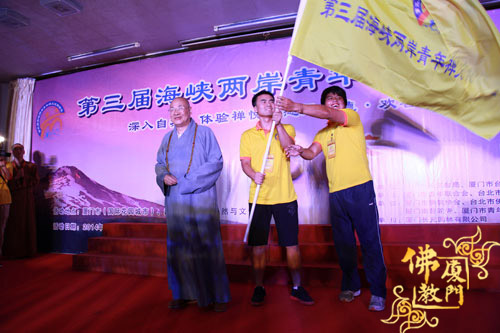 中国佛教协会副会长、闽南佛学院院长圣辉大和尚在最后致辞中表示:希望两岸青年珍惜此次活动因缘,认真聆听讲座,体验禅坐、过堂的佛教生活,亲近大自然,净化身心,过个有意义的暑假。随后,两岸大德法师、嘉宾互赠纪念品,并为营员授营旗及小组旗。