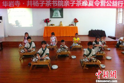 2014年7月28日,为期三天的“2014亲子茶缘公益夏令营”在重庆华岩寺书画院感动落幕,50多个家庭一齐收获了孩子们人生中第一个茶礼。