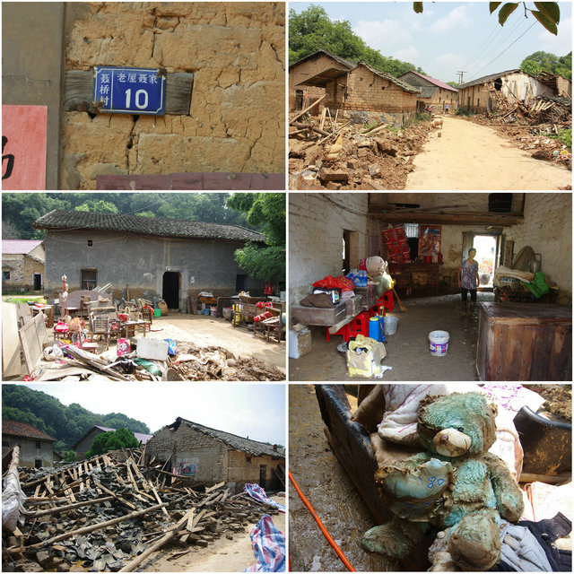 救援人员来到受灾最为严重的德安县聂桥镇聂桥村。这里的景象可谓“惨不忍睹”。村庄就在一座山脚下,靠着一条小河,上游是一个水库和一个采石场。当暴雨大作时,水库的洪水奔突而出,使小河顿时涨溢出岸,迅疾的洪水挟持着石块、泥浆以排山倒海之势,向聂桥村直扑过来。所有的房屋都有进水,屋子里全是泥浆,根本无法下脚。村民养的猪、鸡都跑掉了,而赖以生活的庄稼,则几乎全部绝产。