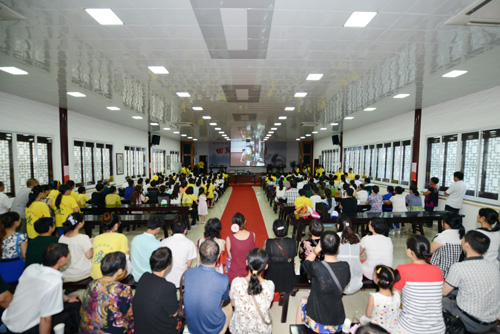 松纯大和尚于此间为夏令营营员作开示,教导他们“诸恶莫作,众善奉行”,并与营员们合影。
