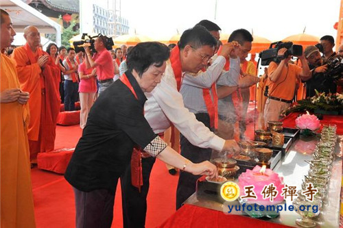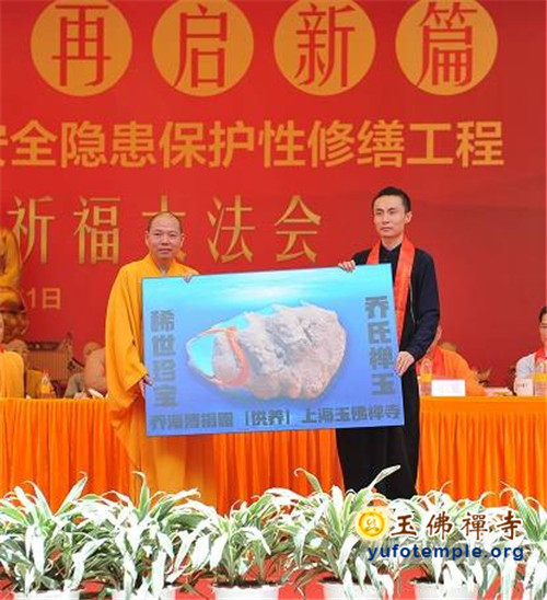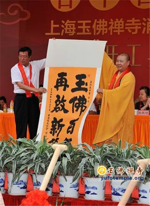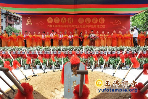 开工典礼上,特邀青年歌手霍尊演唱了由觉醒大和尚作词、著名音乐人安栋谱曲的、专门为玉佛禅寺保护性修缮工程而创作的歌曲《玉佛传灯》。到会的嘉宾代表还为工程剪彩,并奠基培土。开工典礼最后在上海市第十三届人大副主任、玉佛禅寺修缮工程委员会主任胡炜先生启动工程打桩的仪式中达到了高潮。真诚祈愿玉佛禅寺的消除安全隐患工程能修缮顺畅,古刹重光,法缘继兴,功德圆满!
