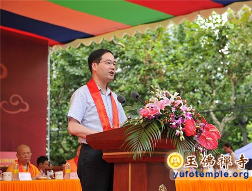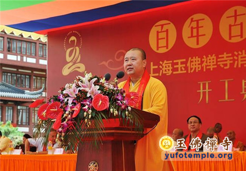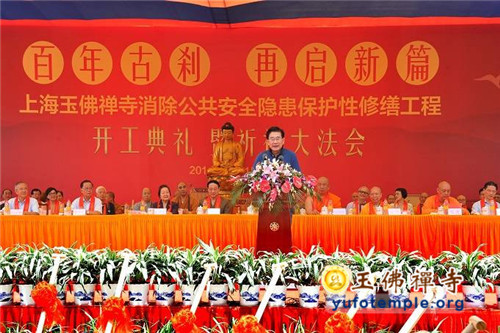 洒净法会结束后,即开始工程开工典礼。典礼由上海电视台著名节目主持人曹可凡先生主持。首先由中国佛教协会副会长、上海市佛教协会会长、玉佛禅寺方丈觉醒大和尚致辞。觉醒大和尚首先感谢各级政府领导和各地诸山长老及佛教信徒、各界嘉宾对玉佛寺修缮工程的关心和支持,在今天这样的高温天气中专程来到现场参加工程开工的典礼,共襄胜举。觉醒大和尚就寺院保护性修缮工程作了简要介绍。工程以“安全第一,保护优先”为原则进行设计和施工,寺院以自筹方式解决工程的费用。修缮后的玉佛禅寺,将在保持原有历史风貌的基础上,合理布局、优化功能,对于消除公共安全隐患、完善基础设施、合理功能布局、优化人文环境,营造神圣庄严而又和谐温馨的寺院氛围,对推动寺院日益发展的文化、慈善事业再上新台阶,都具有极其重要的意义。