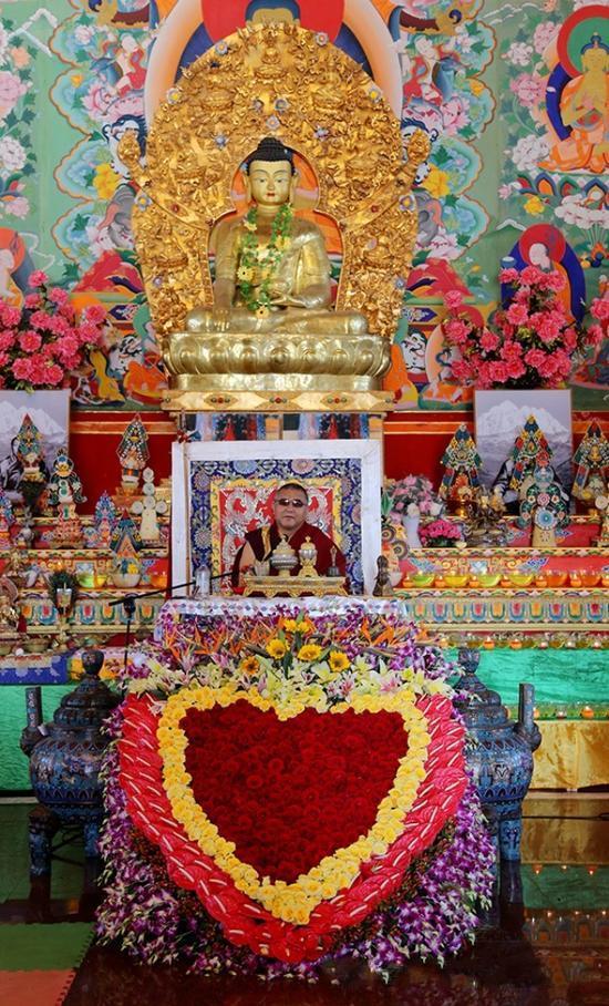 普贤愿供法会时,大殿里满是花的海洋,花香在庄严的大殿里四处流动,上师嘎玛仁波切和雍忠阿阇利一同带领大家唱颂《普贤愿供》仪轨,并抛洒花瓣,以普贤供养云的方式,上供诸佛菩萨以及所有传承上师,下施六道所有苦难如母众生。