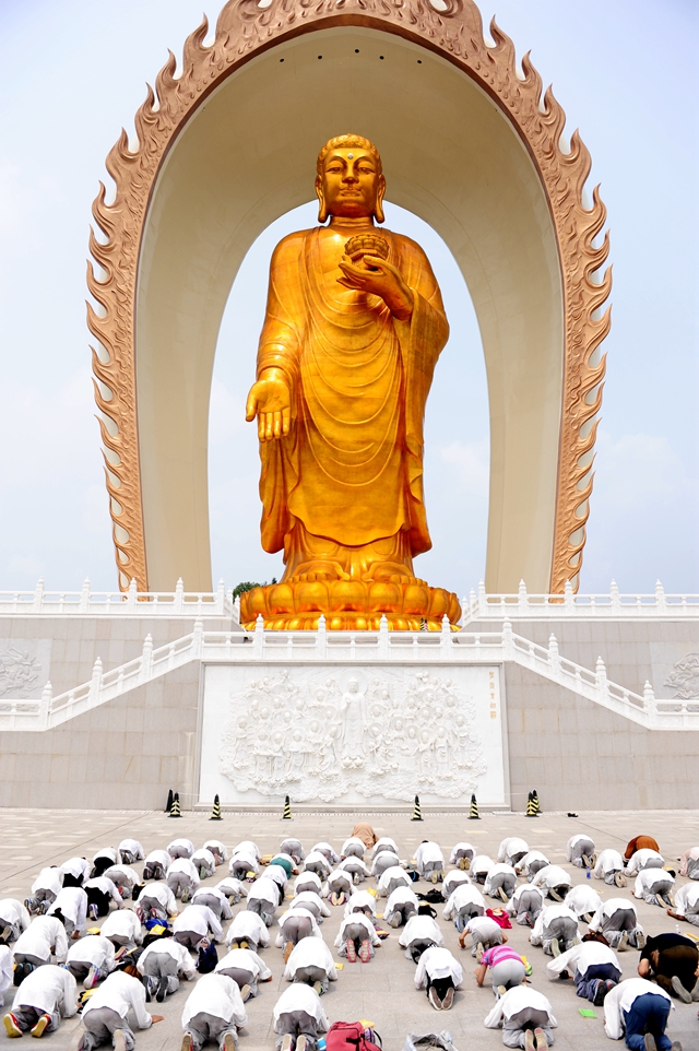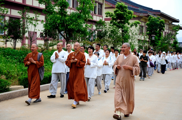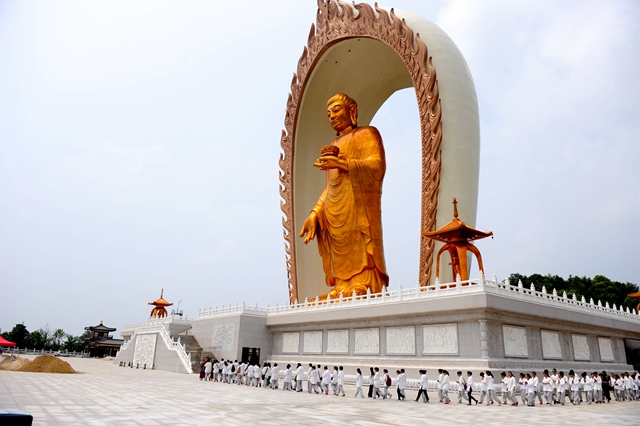 8月7日正午,来自禅宗古刹,黄梅老祖寺的当家师崇延法师,率缁白二众90余人,前来净土苑朝礼东林大佛。 崇延法师一行整齐列队,伴随着法器声,高声念诵弥陀圣号,步行至大佛台。四众弟子在阿弥陀佛圣像前诵经、发愿、回向,并绕须弥台三周。虽然正午烈日当空,汗如雨下,但大家仍踊跃欢喜,纷纷在大佛脚下合影留念。临别前,几位居士遥指须弥台矗立的弥陀圣像,欣然道:“这就是我们未来的样子……”。慈悲喜舍,金色相好,信切愿真,期生净土。 据带队的倪居士介绍,随行人员中除出家师父外,在家居士均是参加老祖寺暑期“生活禅”夏令营的营员,并且大都已皈依受戒。此次自老祖寺到净土苑,并朝礼东林大佛,是夏令营活动安排中的重要一项。居士们大都来自河北,职业以教师为主,大多数人都是初次现场瞻仰大佛圣容。 随着净土苑建设的日臻完善,凝聚着十方檀信真心切愿而铸成的东林大佛,也显露出越来越广泛的影响力。