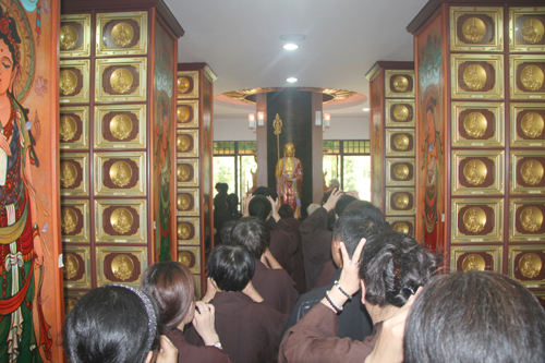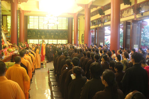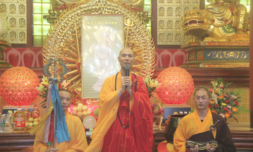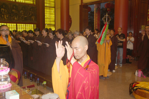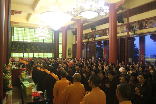 晚18时整,石室禅院内钟鼓齐鸣,四众弟子整齐列队,在地藏菩萨圣号声中缓步向抄经堂行进,一起恭请忠明法师至大雄宝殿主持地藏菩萨昼夜精进七圆满回向灌顶加持法会。仗此七昼夜不间断念诵地藏菩萨圣号的功德回向个人堂上历代祖先、怨亲债主,横死孤魂等众离苦得乐,早生净土!同时祈愿灾历不起、国泰民安、风调雨顺!