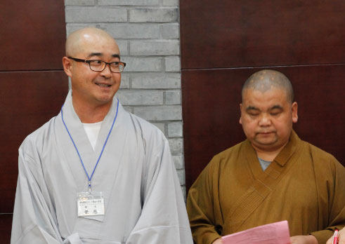 韩方代表团团长觉愚法师讲话(左)(图片来源:黄梅五祖寺 摄影:路鹏杰)