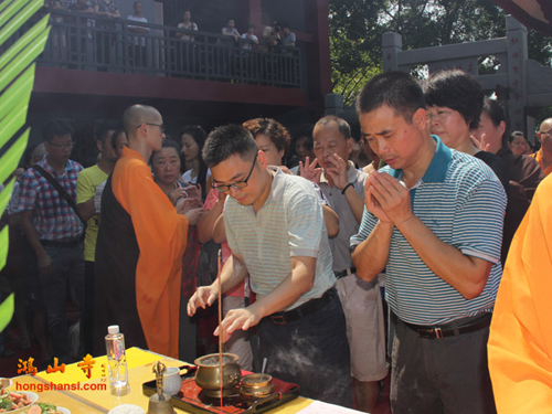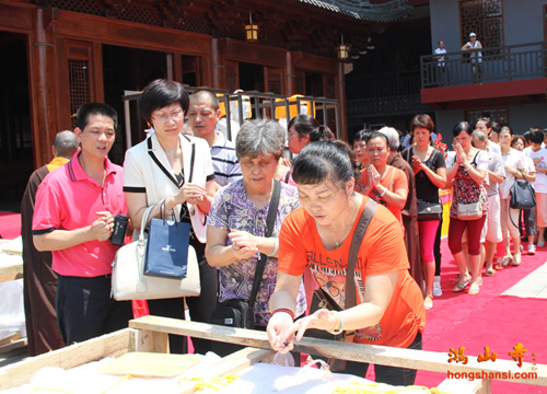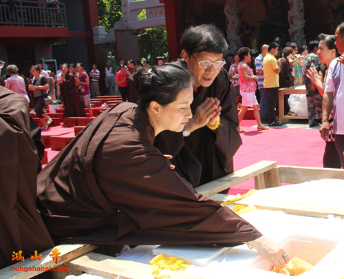 2014年8月25日上午10点,鸿山寺在新寺院隆重迎请四十一尊玉佛圣像,三宝佛、千手观音、文殊、普贤、三十三观音及阿难、迦叶,并为圣像举行装藏仪式。鸿山寺住持法云法师亲自主法。护法善信热情踊跃,以诸珍宝供奉圣像,庄严道场。同沐佛恩,共沾法喜。