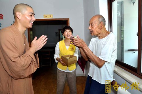 此次铁佛寺中秋“月满心园 有爱更甜”活动小队,由铁佛寺演成法师带领,为湖州夕阳红敬老院、潘家廊敬老院、以及刚不久铁佛寺救助的一位全身被烫伤的小男孩虎子,和以前救助身患白血病的患者郭建新等,给他们送去铁佛寺的中秋问候。此次活动共计送出铁佛寺普觉慈爱义工自己亲手做的素月饼50余份。收到铁佛寺素月饼的老人、孩子和残障人士,品尝着来自铁佛古刹的甜香与祝福,倾听着法师们的开示,感受着义工们浓浓的情意。演成法师扶老人坐下,陪老人唠家常,这些不经意间流露出的自然的关爱,让在场的每一个人都肃然起敬,心生欢喜,大家对僧宝多了一份恭敬,也更加对佛法多了一份信仰。