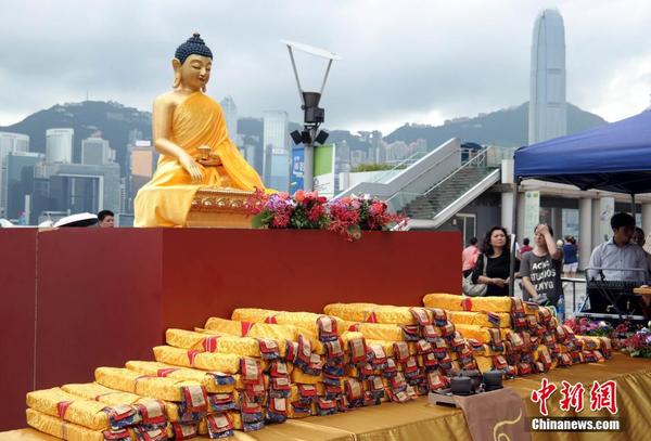 9月8日,近百名僧伽及信众列阵抬起103卷《大藏经》,绕行九龙尖沙咀,希望将爱、慈悲、智慧等正能量传递到香港每个角落,化解矛盾纷争,社会和谐安定。这是第十届香港噶举大祈愿法会的活动之一,众僧伽及信众分三日绕行了香港岛、九龙、新界,祈福香港。
