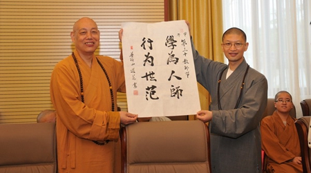 普陀山佛协会长、学院院长道慈法师向学院赠送墨宝“学为人师,行为世范”