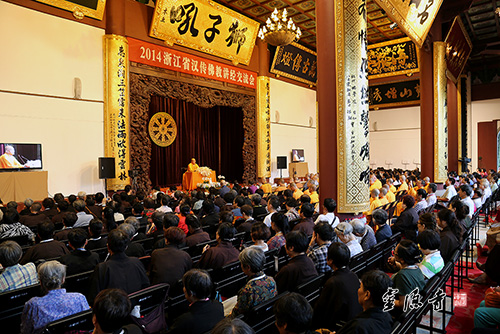 2014浙江省汉传佛教讲经交流会,以“正言正行正能量”为主题,共有20位来自全省各地的讲经法师参加,经过2天4个场次的激烈角逐,通过对《金刚经》、《心经》、《阿弥陀经》、《普贤菩萨行愿品》、《观音菩萨普门品》等十五部汉传佛教经典的演绎,使闻者心生法喜。在当天的闭幕式上,由相关领导为获得一、二、三等奖的讲经法师颁奖。