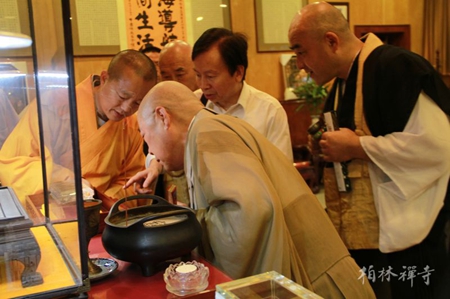 会谈后,岭兴岳长老一行在明海法师陪同下到问禅寮瞻礼净慧长老舍利并合影留念。