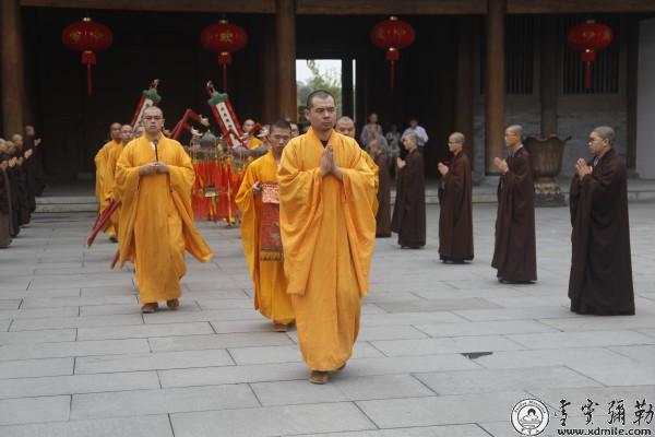 上午九点,浙江省佛教协会会长、宁波雪窦山佛教协会会长、本山方丈怡藏大和尚率两序大众及信众至三门迎接天冠弥勒,在大慈佛国牌楼前的三学桥广场举行了迎请仪式,大和尚拈香、礼拜、宣读迎请文疏后,庄严的仪仗迎请队伍有序地来到了大慈摩尼宝殿。随后,怡藏大和尚、净仁法师、隆悟法师、广能法师、明悟法师为其开光并举行了上供法会。炉香炸热,法界蒙薰……梵音萦绕在整个雪窦山,佛音慈光荡涤着众人的心灵,全山僧众、居士在弥勒慈光普照中,充满了无可言语能表达的欢喜与感恩,整个法会历经两个小时,最后法会回向祈愿中圆满结束。法会祈愿:世界和平、国泰民安、佛日增辉、法轮常转。