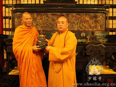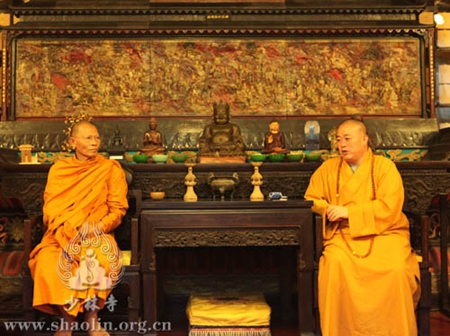 2014年9月23日下午16点,泰国副僧王帕蓬迪乐(Phra promdilok)法师一行20余人,在少林寺延耘法师的陪同下,到少林寺方丈室会谈,受到永信法师的诚挚接待。
