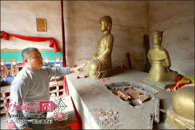 在这个空间不大的砖房内,原本供奉着四尊石佛,三大一小,被窃的是其中的主佛,也是最大的一尊。记者注意到,仍存的三尊石佛坐式相同,皆结跏趺座于半圆莲座上,有两尊大小相近,高约一米多,另一尊相比之下小了很多,高约几十厘米。三尊石佛雕琢手法相同,看上去真实自然,栩栩如生。
