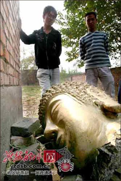 记者注意到,现场地面上扔着一个佛头,即被窃石佛的头部。村民推测了佛头被窃贼遗弃的原因,早在文革期间破四旧时,几尊石佛的头部全被砸毁,后被埋于地下,几年前石佛才偶然被挖出,得以重见天日,村民重新雕塑了佛头,拼接在佛身上,窃贼很可能是不屑于“克隆佛头”的价值而将其遗弃。