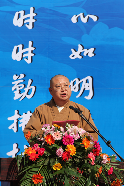 省佛协副会长、黄梅四祖寺方丈明基法师分别代表黄梅县和黄冈市佛协致辞