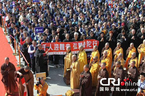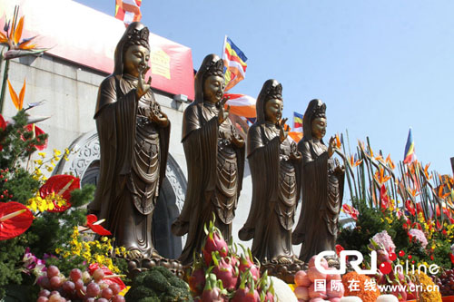 应台湾南海观音文教基金及台湾中国佛教会的再次邀请,普陀山佛教协会为四尊高1.08米、重108斤的硅青铜观音佛像开光。法会由普陀山住持道慈法师和台湾中国佛教会理事长圆宗长老等两岸法师共同主法,来自两岸佛教界人士和信众共1000余人共同见证了这一别具意义的时刻。