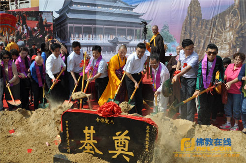 上午10时18分,伴随着悠扬的梵呗声,奠基法会正式开始。宗才法师带领48名法师和80名居士代表执枝洒净,祈福天下。法会现场,佛号不断,四众欢喜。最后在与会领导和海内外四众弟子一起为三圣寺观音殿奠基培土后观音殿奠基法会圆满。
