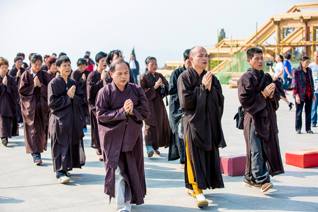 10月19日,秋清日和,来自福建漳州普照寺的传品法师,率当地居士三十余人,专程前来净土苑朝礼东林大佛。 净土苑之行是普照寺缁白二众朝圣之旅的最后一站,之前大家已造访浙江普陀山、安徽九华山等名山古刹。此次前来净土苑,一方面欲一睹四十八米高阿弥陀佛圣像金容,均沾法喜;同时,也想在弥陀脚下恭敬礼拜,表达出离娑婆、求生极乐的愿心。 早斋之后,大家在导览大厅聆听了义工关于阿弥陀佛圣像及净土苑的概要讲解。然后,在传品法师带领下,佛弟子们身着海青,自信愿路开始,称念弥陀圣号,三步一拜至拜佛台。最后,在拜佛台忏悔业障,发愿往生。 当日正值周末,前来净土苑参观朝礼的游客、信众甚多,普照寺佛弟子们一路恭敬虔诚礼拜佛陀的行持,获得大家纷纷赞许。 净土苑自2007年破土动工以来,历经数载,以阿弥陀佛接引圣像为核心的一期中轴线工程,已在如火如荼的紧张施工中逐渐接近尾声。以大安法师为首的东林寺僧团,心怀慈忍,谨守工程建设伊始时的庄严承诺,矢志为广大佛教四众弟子提供一个综合性的服务平台。目前,净土苑已初步具备接待中小规模四众弟子参访修学的能力。