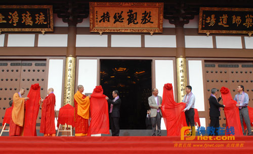 致辞结束后,省民宗委主任冯志礼,省民宗委副主任倪忠扬,温州统战部长陈浩,市政府副秘书长郑秋文,市民宗局局长陈锋进,文成县委书记汪驰,文成县县长王彩莲,中国佛教协会副会长湛如法师,中国佛教协会副会长道慈法师,浙江省佛协会长怡藏法师,温州市佛教协会会长智明法师,安福寺修建委员会主任达照法师,温州市佛教协会副会长万如法师共同为浙江佛学院(筹)温州佛学院揭牌。